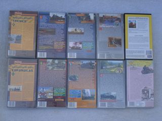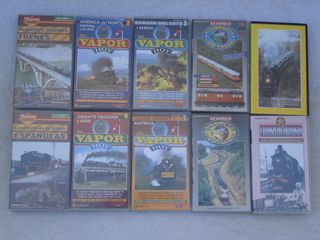 Colección de 10 cintas VHS sobre trenes de España y del mundo. Revive la historia y la fascinación del ferrocarril , tren , via , estacion , poste , locomotora , vapor , diesel , balasto , maqueta , telefono , pito , silbato , ventanilla , catemaria , anden , pasarela - Pequeños Grandes Trenes Vol. 1 - América del Norte, Central y del Sur Vol. 2 - Europa del Este y África Vol. 3 - La vuelta a Escandinavia: 80 Trenes - Locomotoras de Vapor Españolas Vol. 2 - Oriente Próximo y Asia Vol. 4 - Lejano Oriente y Australia Vol. 5 - La vuelta a Francia - Transiberiano - National Geographic Video