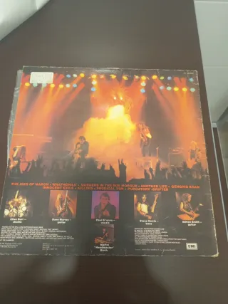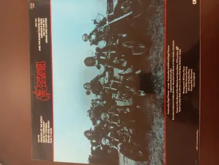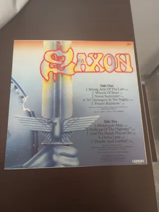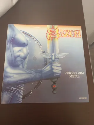 Vinilo del álbum Strong Arm Metal de Saxon, lanzado en 1981. - Portada con diseño icónico. - Incluye la discografía de Saxon de 1981.