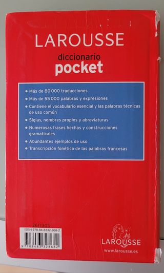 Diccionario Español-Francés con las tapas plastificadas. Perfecto para uso escolar. Por dentro está perfecto. Por fuera solo tiene las esquinas algo gastadas como se ve en la foto de llevarlo en la mochila, pero está en muy buen estado general.