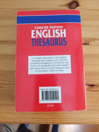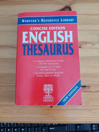 Diccionario de English Thesaurus de sinónimos. Edición de bolsillo. 383 páginas. Ed. Geddes & Grosset. ISBN: 978-1-84205-019-4. Tiene una dedicatoria escrita a mano en la primera página.