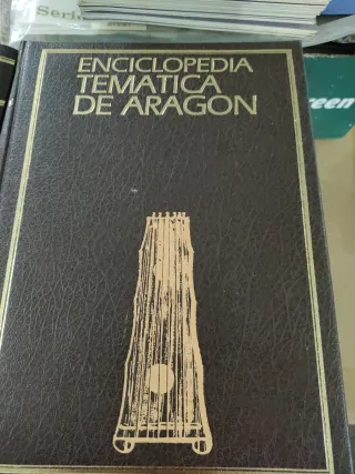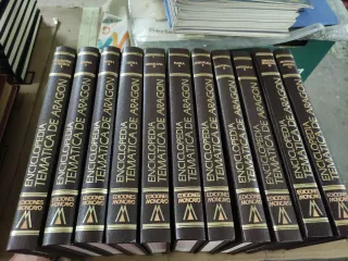 Enciclopedia temática de Aragón, 11 tomos, cada uno de una temática (observable en la foto de los lomos) encuadernada en piel, muy bien conservada