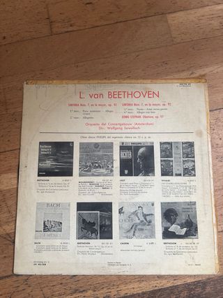 Disco de vinilo con música clásica de grandes compositores. - Incluye obras de Beethoven, Mozart y Wagner. - Beethoven: Sinfonía N.º 8 en Fa Mayor, Op. 93. - Mozart: Serenata Nocturna Eine Kleine Nachtmusik. - Wagner: Cabalgata de las Walkirias. - Interpretaciones por la Orquesta Pro-Música de Stuttgart, la Orquesta Sinfónica de la Radio de Alemania del Sur y la Orquesta de los Teatros Nacionales de Württemberg. - Direcciones de Walter Davisson y Josef Dunnwald. - Pieza de Chopin: Polonesa N.º 6 (Heroica) interpretada por Jean Guitton.