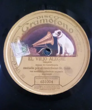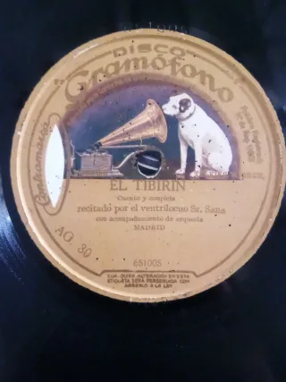 Disco de pizarra con la grabación" El Tibirín "y "El Viejo Alegre" - Cuento y couplets recitados por el ventrílocuo Sr. Sang. - Acompañamiento de orquesta. - Grabación de Disco Gramófono. - Incluye número de serie 651005.