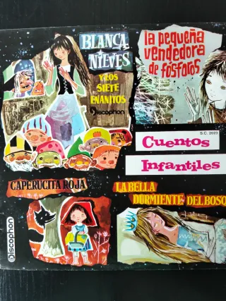 Disco de vinilo con una colección de cuentos infantiles. - Títulos incluidos: La Bella Durmiente del Bosque, Blancanieves, El Flautista de Hamelín, La Ratita, La Cenicienta. - Portada ilustrada con personajes de cuentos clásicos. vintage restaurado talla ropa mudanza Salón comedor retro Nike deporte clásico mueble diseño viaje colegio espejo regalo regala chollo cortinas lámpara mochila mesillas mesa Iphone televisor coche bicicleta Pandora zara LeroyHistoria prensa periódicos estudiante periodismo televisión Mudanza radio Revista arte Fotografía flash cámara vídeo cassette cinta Objeto,.