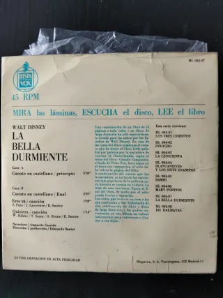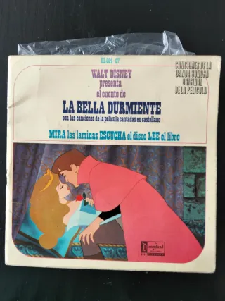 Pequeño disco de vinilo con el cuento de Walt Disney La Bella Durmiente. Copyright 1960 Walt Disney Productions - Canciones de la banda sonora original de la película. - Incluye las canciones cantadas en castellano. - Formato: Mira las láminas, escucha el disco, lee el libro.