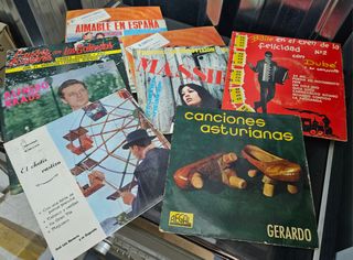 44 vinilos de 45 rpm, excepto un par de cuentos, todos en perfecto estado. Música años 60-70.