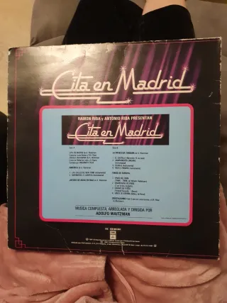 Disco de vinilo con el álbum Cita en Madrid. - Portada con diseño artístico. - Incluye Scala Meliá Castilla y Madrid en la portada.