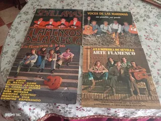 Conjunto de cuatro discos de vinilo de sevillanas y flamenco.de los años 70 con algunas señales de uso normal - Sevillanas - Voces de las Marismas - Flamencos de la Puebla - Los Flamencos de la Isla - A la Sombra de Sevilla - Arte Flamenco