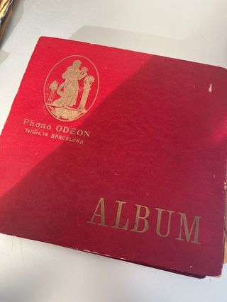 Álbum de Phono Odeon con 9 discos. - Diseño clásico en color rojo. - Grabado Phono Odeon y Tallers, 16 BARCELONA. - Detalle de figura clásica en relieve. - Título ALBUM en dorado.
