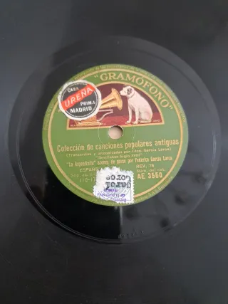 Disco de pizarra de 1931 con La Argentinita acompañado al piano por Federico García Lorca. - Colección de canciones populares antiguas. - Sevillanas Siglo XVIII. - Grabación de Gramófono. - Editado por Casa Ureña, Madrid. - Fabricado por La Compañía Gramófono S.A.E. Barcelona.