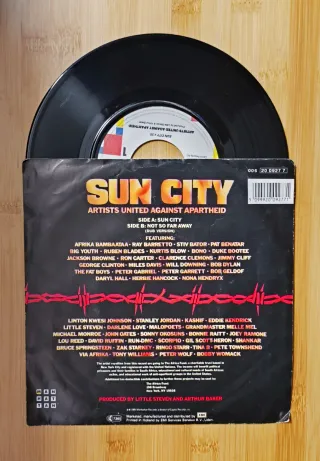 Single de vinilo Sun City de Artists United Against Apartheid. - Cara B: Not So Far Away (Dub Version) 5:50 Cara A: Sun city - Incluye funda original. Bono de U2, bruce Springsteen, joey Ramone, ringo starr, lou reed, Bob Dylan, peter Gabriel, entre otros Portada y disco VG+