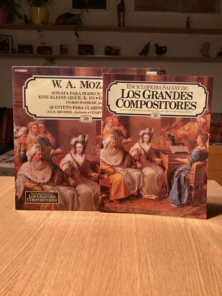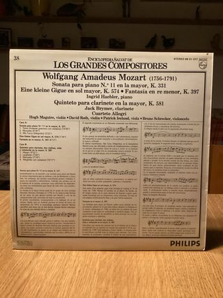 Disco de vinilo de Wolfgang Amadeus Mozart, volumen 38 de la colección Enciclopedia Salvat de Los Grandes Compositores. - Incluye Sonata para Piano N.º 11, K. 331 Alla Turca, Eine Kleine Gigue, K. 574 y Fantasía K. 397. - Interpretaciones de Ingrid Haebler (piano) y Jack Brymer (clarinete). - Grabación estéreo de Philips.