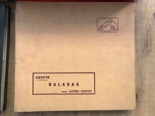4 discos de pizarra (La voz de su amo) con las Baladas de Chopin, interpretadas por Alfred Cortot. En buen estado de conservación. 1) Balada nº 1 en sol menor 2) Balada nº 2 en fa mayor 3) Balada nº 3 en la bemol mayor 4) Balada nº 4 en fa menor