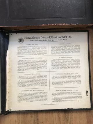 Álbum de 13 discos de pizarra para gramófono de 12 pulgadas. Piezas antiguas con etiquetas originales. - Sellos: La Voz de su Amo y Odeon. - Títulos destacados: El Virolai por la Escolania de Montserrat, Barbero de Sevilla, Aida de Verdi, etc. - Incluye fundas de papel. - Fabricados en Barcelona.