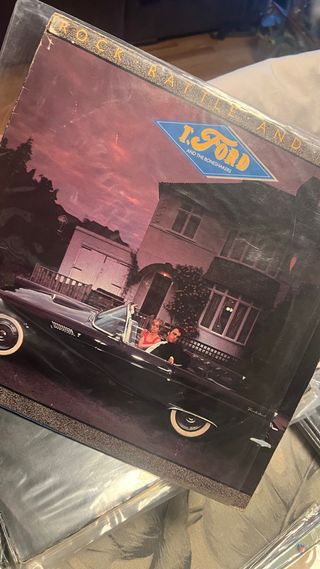 Colección de 75 éxitos de Rock 'n' Roll. - Incluye varios discos de vinilo. - Portada con diseño retro de baile y coche clásico.
