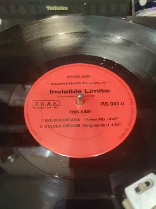 Vinilo de Invisible Limits con dos versiones de Golden Dreams. Sólo disco sin carátula - Other Side: Golden Dreams (Dance Mix) 5'11 - This Side: Golden Dreams (Trance Mix) 4'45 - This Side: Golden Dreams (Original Mix) 4'54 - Fabricado por TECNOCD. Probado sólo vinilo sin carátula