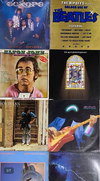 Colección de vinilos de música pop y rock. - Europe - The Final Countdown - The Ripoffs - Golden Age of The Beatles - Elton John - Canciones de Oro - The Alan Parsons Project - The Turn of a Friendly Card - Bob Dylan - Street Legal - Dire Straits - Money for Nothing - Brothers in Arms Serian todos los mostrados en fotos. Tal cual se ven. La mayoria en muy buen estado, algunos con cartones algo deteriorados. El de Heroes del silencio esta completo menos el vinilo. El de Elton Jhon le falta un trocito que afecta a la primera cancion creo recordar. Se incluye tb un disco sin funda de loquillo y los trogloditas. Precio rebajado por lo