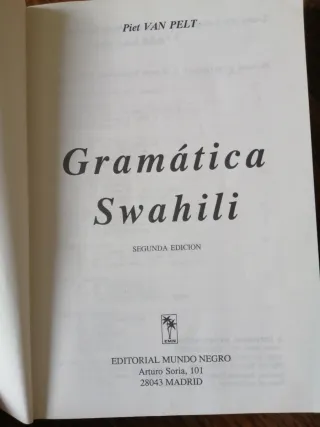 Libro de texto para el aprendizaje de la gramática swahili, idioma africano hablado por más de 40 millones de hablantes. Traducción y adaptación del libro de Piet Van Pelt. Interior en perfecto estado, como está forrado de plástico para su protección de las tapas, con manchas debido al celo y al paso del tiempo, según foto incluida.