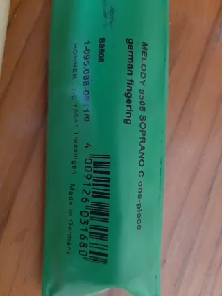 Flauta dulce Hohner Melody Soprano C de una pieza, con digitación alemana. Incluye varilla de limpieza y funda. - Marca: Hohner - Modelo: Melody 9508 - Tipo: Soprano C - Digitación: Alemana - Incluye: Varilla de limpieza y funda verde