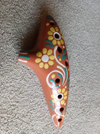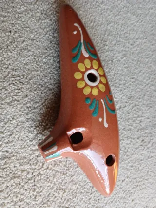 Instrumento musical ocarina de barro o cerámica, esmaltada, con un diseño artesanal y decorado. - Color terracota. - Motivos florales en amarillo, blanco y verde. - Boquilla lateral. - Tiene en una esquina una marca o sello de producto artesano con forma de corazon. - Mide unos 22 cm de largo. Como nueva, desconozco cuál será su afinación, por lo que no se aceptarían devoluciones por ese motivo.