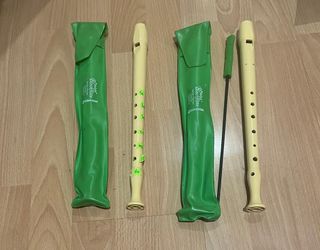 Se venden dos flautas dulces Hohner Blockflöte, en color beige claro. Se incluyen dos estuches verdes. Las flautas estan en buen estado. Una de las flautas tiene unas pegatinas de las notas, pero se pueden remover sin dejar marca.