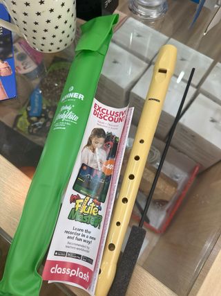 Set de flauta dulce para niños, ideal para iniciarse en la música. Incluye funda protectora de diseño y varilla limpiadora. Marca HOHNER. - Flauta de color crema. - Funda con diseño colorido y musical. - Varilla con mango verde para limpieza.