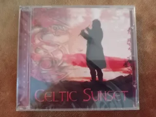 Sumérgete en la atmósfera de Celtic Sunset, un CD que te transportará con sus melodías. - Portada con diseño inspirado en el arte celta. - Imagen de un músico tocando la flauta al atardecer.