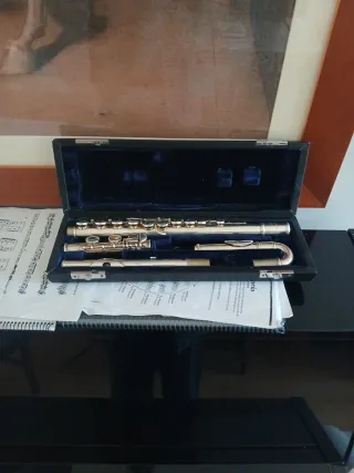 Flauta travesera plateada, ideal para estudiantes o músicos. - Incluye estuche rígido forrado en terciopelo azul. - Piezas desmontables para facilitar el transporte. - Acabado metálico brillante. Ha sido usada durante los 4 años de enseñanzas Elementales. Ha sido llevada recientemente al lutier y sido ajustada.