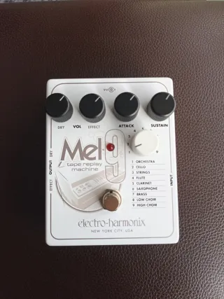 Pedal simulador de instrumentos clásicos Electro-Harmonix Mel 9. - Sonidos de orquesta, cello, cuerdas, flauta, clarinete, saxofón y brass. - Controles de volumen, ataque y sustain. - Salidas de efecto y dry. - Fabricado en New York City, USA.