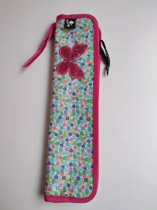 Funda para flauta con un alegre diseño de flores y una mariposa brillante. - Estampado floral multicolor. - Mariposa decorativa con lentejuelas. - Cierre de cremallera. - Asa lateral para colgar.