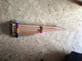Instrumento musical de viento tradicional. - Fabricada con tubos de bambú. - Decorada con cintas tejidas y pompones. - Diseño artesanal.