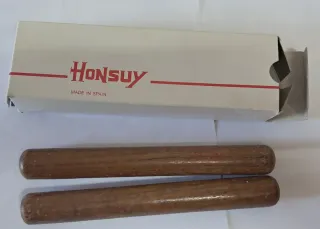 Set de música que incluye un par de claves de madera Honsuy y una flauta dulce Hohner con instrucciones. La flauta tiene una pequeña quemadura (ver foto), pero funciona perfectamente.