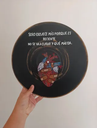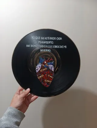 🎨 Discos personalizados por encargo. 📩 Contacta antes de comprar para definir diseño y presupuesto. 🎬Harry Potter, juego de tronos, anatomia de grey, Disney, Friends,los bridgerton, Shrek, Cars, Hércules, stranger things, Enredados, Mulan, código Lyoko, Sailor Moon, Jurassic Park, Narnia, Crepúsculo, Miercoles, Coraline, Indiana Jones, Breaking bad, kill Bill 🎶Marea, Extremoduro, One Direction, Auryn, Aitana, Queen, Melendi, pereza, BTS, Taylor Swift, Olivia rodrigo. 🎮Red dead, Uncharted, The Witcher, Assassin's Creed, Mario Br - Vinilo pintado a mano. - Diseño original con frase. - Inspirado en la canción de Andrés Calamaro.