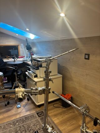 Rack para batería marca Millenium. - Estructura metálica cromada. - Múltiples soportes ajustables. La barra curva central es más pequeña por que se ha recortado Falta alguna pieza mas, que la tengo guardada, asi como los soportes de platos Solo para recoger en Fuensalida
