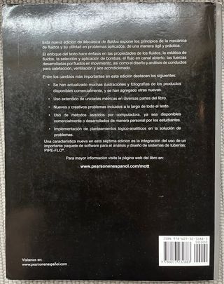 Libro utilizado en la asignatura de Mecánica de Fluidos en la Facultad de Ingeniería de la Universidad de Deusto. Por fuera puede estar algo usado, pero por dentro se encuentra nuevo, no tiene ninguna marca ni apunte.