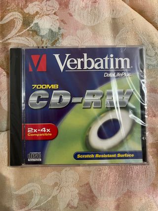 Disco CD-RW Verbatim precintado de 700MB. - Capacidad de 700MB. - Tecnología DataLifePlus. - Compatible 2x-4x. - Superficie resistente a arañazos. CD-RW 700 mb verbatim datalifeplus scratch resistant surface 2x-4x compatible compact disc rewritable superficie con proteccion de larga duracion compatible con las ultimas grabadoras de cd superficie disponible para su rotulacion individual garantia de por vida cd virgen precintado