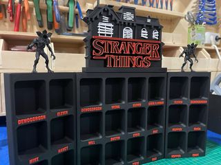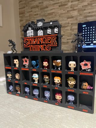 Expositor para figuras de kinder joy de Stranger Things. Ideal para coleccionistas. - Diseño inspirado en la serie. - Capacidad para todas las figuras de la coleccion kinder joy Incluye las bases para las miniaturas que les hacen falta.