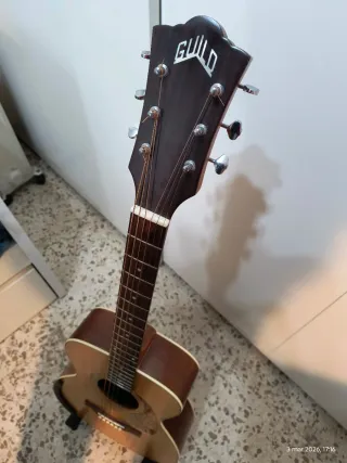 Comodísima guitarra electroacústica Guild M240e con un acabado natural y detalles cuidados. Gran sonido, calidad. - Cuerpo de estilo Concert con tapa de abeto. - Fondo y aros de caoba. - Mástil de caoba con diapasón de palisandro. - Cejuela y selleta de hueso Con funda Fender FAS620 para guitarra acústica concert 40€ más, 360€. Fondo de caoba arqueado. Previo Fishman GT-1.