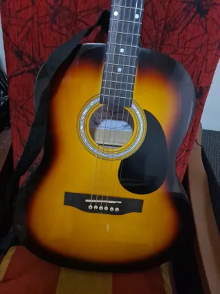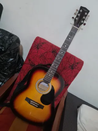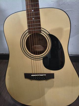 Guitarra acústica marca Harley Benton en buen estado, ideal para iniciarse o para tener un instrumento adicional. Incluye funda protectora y cejilla. - Guitarra acústica - Funda para guitarra - Cejilla