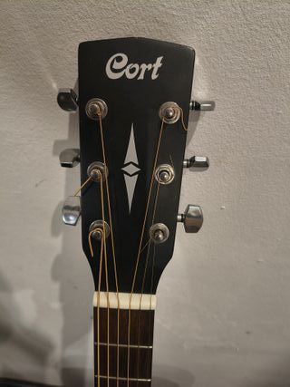 Guitarra acústica de la marca Cort en color negro. Presenta un diseño clásico y elegante. - Logo de la marca Cort en la pala. - Clavijero plateado. - Cejuela blanca.