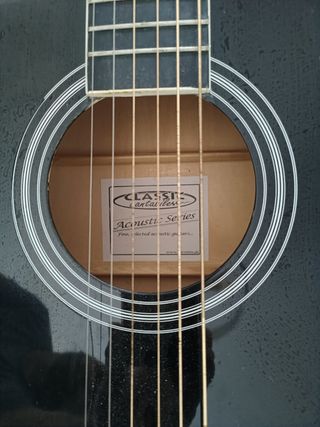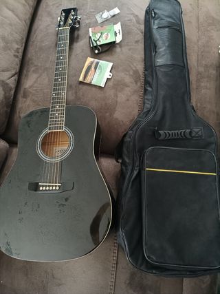 Guitarra acústica de color negro. - Cuerpo brillante. - Seis cuerdas. - Diseño clásico. Usada solo 4 meses, comprada para el Erasmus. Tiene únicamente 4 meses de uso. Incluye funda para guitarra
