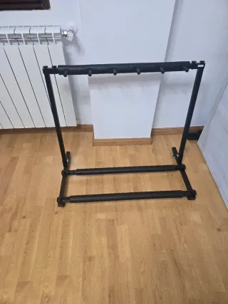 Soporte de suelo negro para varias guitarras. Su diseño permite colocar varios instrumentos de forma segura. - Estructura metálica resistente. - Base estable con protectores de goma. - Diseño plegable para facilitar el almacenamiento. Soporte Guitarra de suelo para 5 instrumentos | Rack plegable universal para guitarra eléctrica, acústica o bajo | Estructura metálica resistente con protección de espuma y montaje sin herramientas