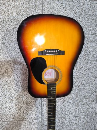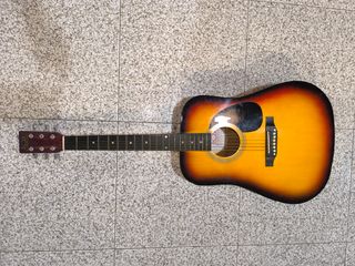 Guitarra acústica en buen estado, lista para ser tocada. Incluye funda para su transporte y protección. - Acabado sunburst. - Cuerpo de madera. - Seis cuerdas metálicas.