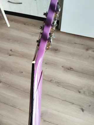 Guitarra acústica con diseño inspirado en Hannah Montana. Ideal para jóvenes músicos. - Color lila con motivos florales y mariposas. - Logo de Disney en el clavijero. Funciona bien, aunque tiene una grieta en el brazo.