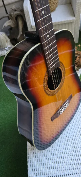 Guitarra acústica 12 cuerdas guitarra de la marca Admira por la etiqueta tiene que ser de los años 80 la guitarra es muy peculiar por qué es acústica pero con el diapasón de una guitarra española creo que es muy difícil encontrar un modelo así la guitarra está en muy buen estado tiene algunas grietas como se ve en las últimas fotos pero es el barniz lo tengo comprobado no es la tapa y quiero quedar eso bien claro solo es el barniz si la puedes ver en persona lo podrás comprobar si se debería cambiar en un futuro el clavijero porque hay algunos van un poco duros pero hacen su función mas guitarras en mi perfil