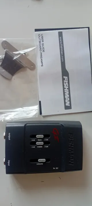 Preamplificador Fishman G2 para guitarra acústica. Este dispositivo cuenta con controles de graves, agudos y volumen. - Controles de graves y agudos con ajuste de +/- 12dB. - Control de volumen. - Entrada de 9V DC. - Conexiones de entrada y salida.