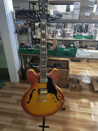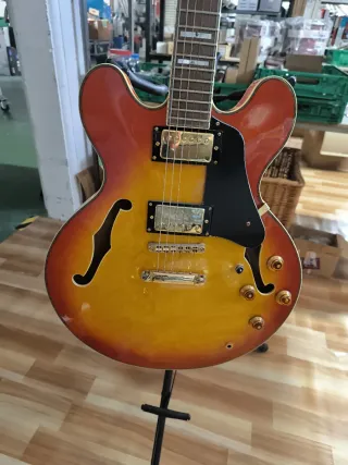 Guitarra semi-acústica Richwood con acabado degradado. - Cuerpo con cutaway. - Pastillas doradas. - Incrustaciones en el mástil.