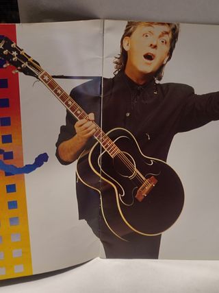 Calendario póster de Paul McCartney de 1993. La imagen muestrs el artista, una figura legendaria del rock. En la primera foto, McCartney posa de manera solemne con su icónico bajo Hofner, un instrumento que se asocia directamente con su legado en The Beatles. La segunda imagen, en cambio, lo muestra en una pose más enérgica y dinámica, tocando una guitarra acústica. El diseño del póster utiliza colores vibrantes en el costado, formando el nombre McCartney, lo que le da un toque distintivo. Este objeto es claro recuerdo de la era de los 90, cuando McCartney seguía siendo una fuerza creativa Además hay cantidad de fotps