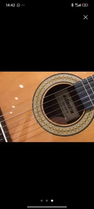 Guitarra clásica Admira de 1978. Admira Sevilla (Vintage) - Único dueño y sin ninguna modificación de cuando se compró. Guitarra con historia y sonido excepcional. Mi padre me la regaló hace 46 años y ha tenido muy poco uso. La madera está curada, lo que le da un tono superior a las modernas. Estado: Bien conservada. Tiene un pequeño detalle estético (falta algo de material) donde puse pegamento, pero es solo visual y no afecta al sonido. Protección: Golpeadores blancos instalados para evitar arañazos al rasguear. Mantenimiento: Cuerdas nuevas recién puestas (10 €). Se puede pasar a ver sin compromiso.