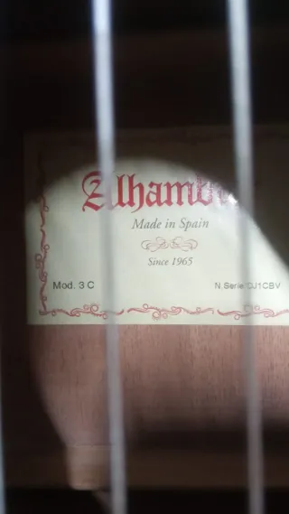 Guitarra clásica ALAMBRA 9C, fabricada para Real Musical. Año 83, tapa cedro y diapason de ébano. El mástil es muy cómodo. Solo un dueño. La amplifiqué luego en la misma casa ALAMBRA, con un previo fishman de alta gama con pastilla en el puente y micro interno. Sonido precioso con o sin amplificación.